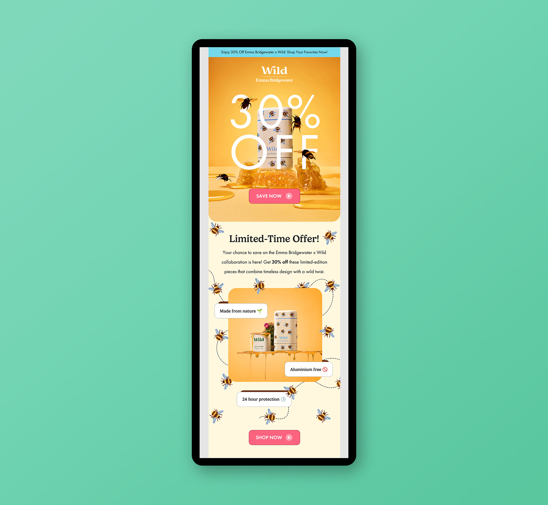 A combination of playful elements (bees and nature) and strong calls to action that align with the brand’s values and the need to drive sales through a limited-time collaboration offer.